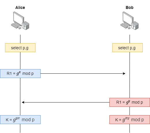 결국 둘은 K=(g^{xy}\) mod p 인 대칭키를 갖고 있게 됩니다. 아래의 그림은 그 과정을 나타냅니다.(오타가 있네요. 아래 그림에 Bob이 생성한것은 R1이 아니라 R2입니다.)