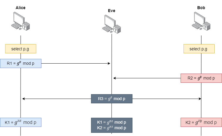 만약 Alice와 Bob 사이에 공격자가 있다면 어떻게 될까요? 어찌 저찌 되어서 Alice가 Bob과 통신해야하는 것을 Eve로 착각했다고 합니다. Bob 역시 Alice와 통신을 해야하는데 Eve가 Alice로 알고 있다고 해봅시다. 그러면 Alice는 R1을 계산해서 Eve에게 주고, Bob도 R2를 계산해서 Eve에게 줍니다. Eve는 자신도 z를 정해서 R3를 양쪽 모두에게 전달해줍니다.