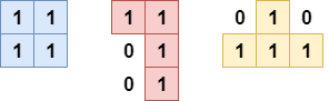 1은 블록이 있는 공간을 말하고 0은 블록이 없는 공간을 의미합니다. 이해가 더 잘가기 위해 아래 세가지 테트리스 블록을 그림으로 첨부했습니다.