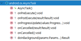 AsyncTask는 어떤 식으로 동작하게 될까? 다음은 몇안되는 AsyncTask의 메소드들인데 그냥 알아두면 편하다.