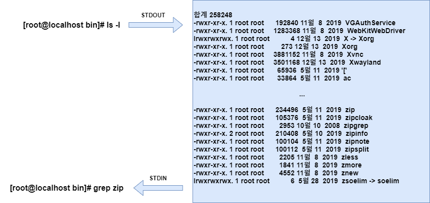 그렇다면 ls -l로 우선 표준 출력을 하고 이 표준 출력된 내용을 zip이라는 인자를 전달받는 grep에게 표준 입력으로 전달시키면 되겠죠?