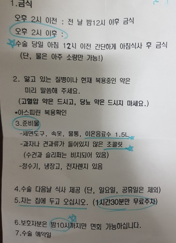 수술하기 전에 주의 사항을 주는데 대충 아래 사진과 같다. 난 만일을 대비해 아침도 먹지 않았다.