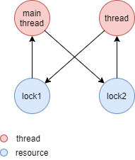 한편 생성된 스레드는 lock2는 점유했고 lock1을 얻은 후에 임계 영역을 진입하려합니다. 하지만 lock1은 이미 메인 스레드에 의해 점유되었습니다. 따라서 lock1이 해제될때까지 기다려야합니다.