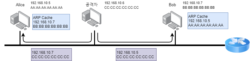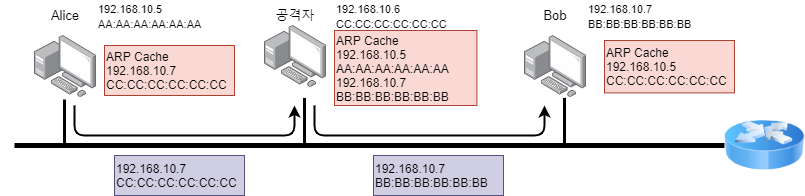 반대로 Bob이 Alice에게 데이터를 보낼때도 공격자를 거쳐가게 되죠. Bob의 ARP Cache도 오염되어 공격자의 MAC주소로 업데이트되었기 떄문이죠.