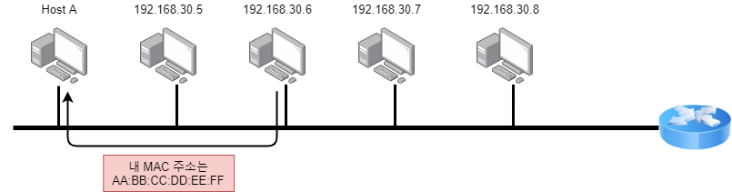 1. 초기 Host A는 192.168.30.6에 MAC주소를 모르니까 네트워크 전체에 192.168.30.6에 대한 MAC주소를 물어보는 요청을 보냅니다.