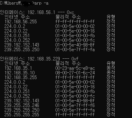 실제 ARP cache는 어떻게 생겼을까요? cmd 창을 열고 arp -a 명령을 처보면 아래와 같이 ARP Cache 내용을 볼 수 있습니다. 저는 가장 호스트까지 있기 때문에 인터페이스가 2개가 잡히는데, 아니면 하나만 보일 수 있습니다. 여기에 IP주소와 MAC주소가 보이시죠? 그리고 맨 오른쪽에 정적, 동적이 보이는데, 정적은 등록된 ARP정보가 수동으로 시스템 종료가 되기 전까지 영구적으로 설정이 된것이고 동적은 컴퓨터가 알아서 설정한 것이고 시간이 지나면 없어지게 됩니다.