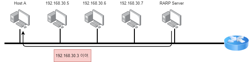 2. RARP 서버는 요청한 호스트 A의 IP 주소를 담은 RARP 응답 메시지를 만들어 Host A에게 전송합니다.