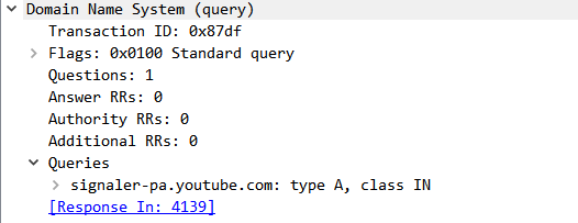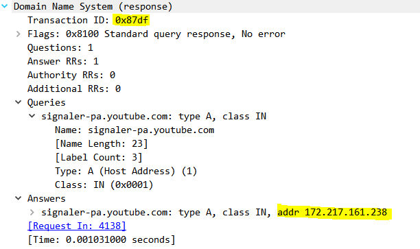 그리고 그에 대한 응답입니다. 응답에서 Transaction ID를 보면 이전에 요청했던 Transaction ID와 같은 것을 볼 수 있습니다. 그리고 우리가 알고 싶은 IP주소는 Answer필드에 있는 것을 볼 수 있네요.