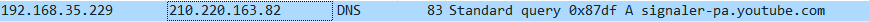 실제 DNS 헤더는 어떤 정보를 담고 있을까요? 다음은 저의 DNS 패킷 중 하나입니다. 제가 사용하는 DNS서버의 주소는 210.220.163.82 인것을 알 수 있습니다. 여기에 Transaction ID와 Flag, 그리고 가장 밑에 질의(Query)를 볼 수 있습니다. 질의 형태(type)은 주로 A인데요. DNS의 본질인 IP주소를 받아오는 질의 타입이 A입니다.