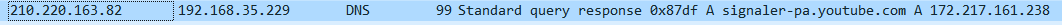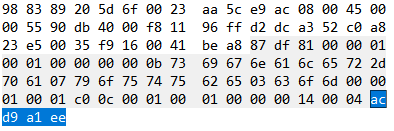 DNS의 패킷 그대로를 살펴보면 가장 마지막 4바이트가 우리가 원하는 주소라는 것을 알 수 있습니다. AC D9 A1 EE(172 217 161 238)이 주소이지요.