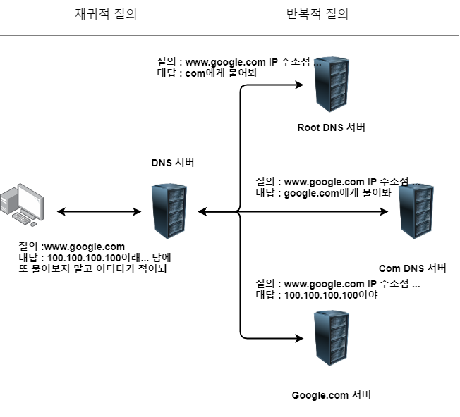 사용자의 컴퓨터는 google의 주소를 서버에 물어봅니다. 우리가 www.google.com이라고 치면 사실 www.google.com. 으로 되어 접속이 됩니다. 여기 맨 끝에 끝나는 . 을 루트 도메인이라고 부릅니다. 자, 우리가 직접 물어본 서버는 이제 최상위의 Root DNS서버(.)에게 google IP에 대해 질의합니다. Root DNS 서버는 다음 도메인(.com)의 서버를 알려줍니다. 이제 우리 서버는 COM 서버에 질의합니다. 이 불친절한 com 서버도 역시 google.com의 서버에게 질의하라고 넘깁니다. 이제 google.com 서버에 질의합니다. google.com은 www.google.com의 IP주소를 를 알려줍니다. 이제 우리의 서버는 IP주소를 사용자에게 알려주지요. 이렇게 주소를 받은 사용자 컴퓨터는 다음에 또 물어보기 미안하기 때문에 DNS Cache에 일정시간 동안 저장합니다.
