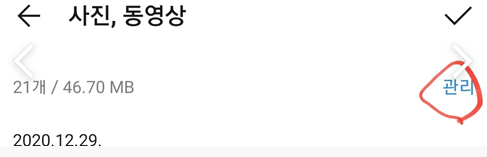 여기에 우측 상단에 관리가 있습니다. 여기서 모두 삭제를 누르시면 전부 삭제되서 저장공간이 확보됩니다.