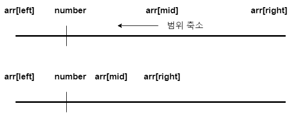 이 역시 Binary Search로 구현되는데요. 구현한 모습은 아래와 같습니다. 중간의 비교문이 반대로 됐음을 알 수 있죠? 이것은 arr[mid]의 값이 number의 이하일때 number와 최대한 같은 값의 index를 찾기 위함입니다.