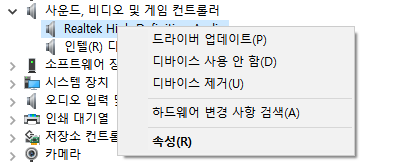 드라이버 탭을 보면 정보와 업데이트, 사용안함 이런 버튼이 존재하는지 알 수 있습니다. 여러분들이 간혹가다가 멀쩡한 스피커에서 소리가 안들릴때 있지 않나요? 그때 한 방법은 컴퓨터를 reboot하는 방법이 있겠지만 아래의 디바이스 드라이버를 다시 구동시켜주면 됩니다. 어떻게 하냐구요? 간단합니다.