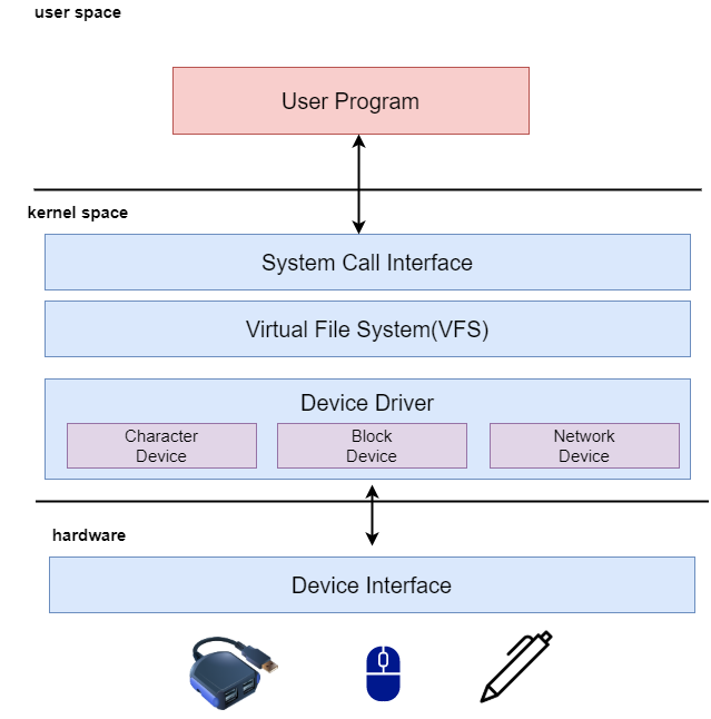 시스템 콜이 호출이 되면 이제 커널 영역(kernel space) 내부로 호출이 전달됩니다. 커널 내부에 있는 가상 파일 시스템으로 전달, 그리고 아까 이야기했던 디바이스 드라이버가 인터페이스를 통해서 하드웨어를 제어합니다.
