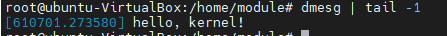 무소식이 희소식인 리눅스 세상에서 아무런 응답이 없으니 잘 설치된것 같은데요. 우리가 코드에서 init_module에서 printk로 문자열을 출력해주었죠? 모듈이 등록되었으니 분명 메시지가 나올테니 확인해보세요. dmesg | tail -1로 가장 마지막 줄을 확인해보도록 합시다.