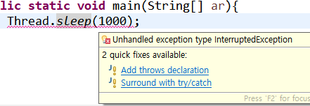 예외는 Compile시에 발견할 수 있는 예외와 프로그램 실행시에 발생하는 예외 두 종류가 있습니다. Compile시에 발생할 수 있는 예외는 아래의 사진과 같이 Eclipse와 같은 IDE를 쓰신다면 빨간줄로 예외를 처리하라고 욕합니다.
