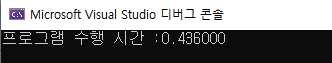제 컴퓨터가 좋은 편이 아니라 0.436초 걸리고 난 후에 프로그램이 종료되었음을 알 수 있네요. 프로그램 수행시간을 측정하는 방법은 이처럼 clock() 함수를 이용해서 구해낼 수 있습니다. 이렇게 우리가 만든 알고리즘이 얼마나 걸리는지도 확인해볼 수 있겠습니다.