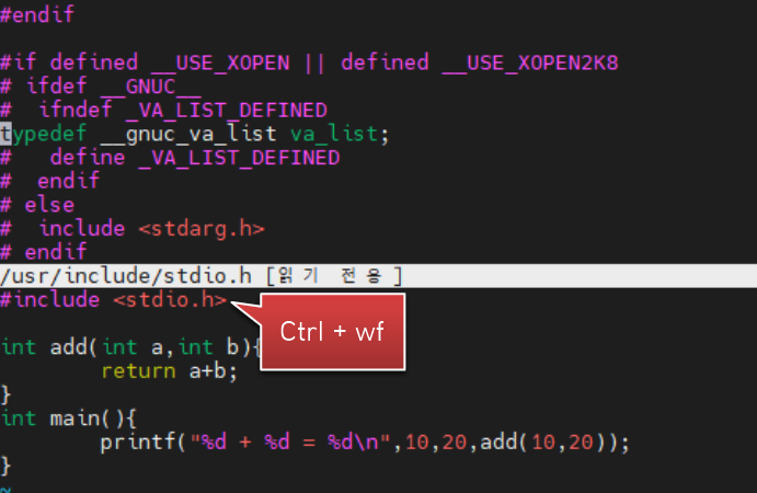 헤더파일에 ctrl+wf를 누르면 헤더파일의 내용을 창분할로 볼 수 있습니다. 아래와 같이 stdio.h의 내용을 보고 싶으면 커서를 헤더파일 이름에 위치시키고 ctrl 키와 w,f 를 차례대로 누르면 됩니다.