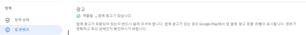구글 플레이 콘솔 -> 출시 앱 선택 -> 왼쪽 하단 앱 콘텐츠 선택 -> 중간쯤에 광고란 확인