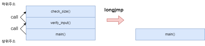 사실 스택 프레임을 거꾸로 돌린다고 표현하는게 더 정확할 것 같네요. 여기에 위 코드의 동작과정을 그림으로 표현하였습니다. check_size()에서 longjmp를 호출했을때의 상황입니다.
