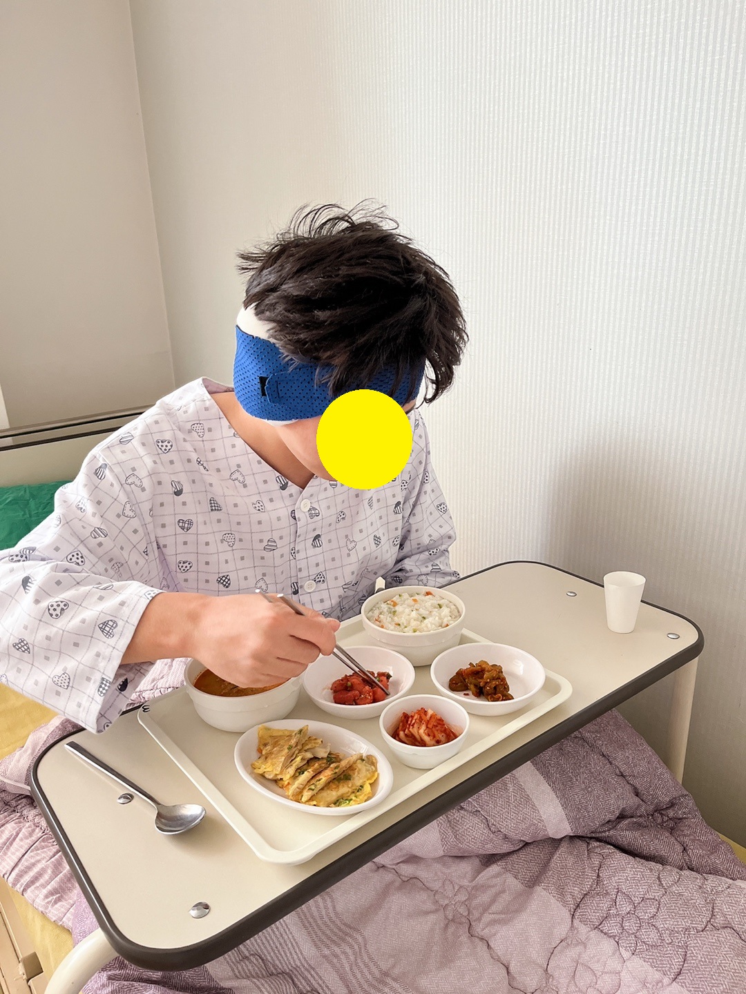 사진에 보이는거 파란색 머리띠 저게 진짜 답답하긴 한데, 그 안에 거즈로 피를 막아놓고 고정해서 차고 있어야한다. 수술이 7시부터 9시 살짝 넘어서 끝났고, 이 거즈는 세시 정도에 의사샘이 갈아준다. 이때 본인 피 보고 놀라지 마시길...