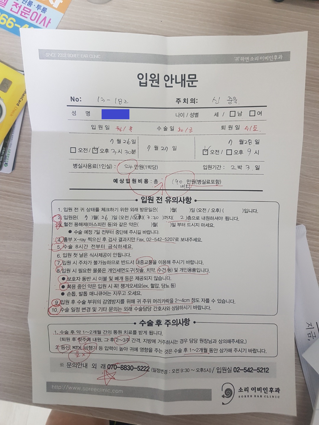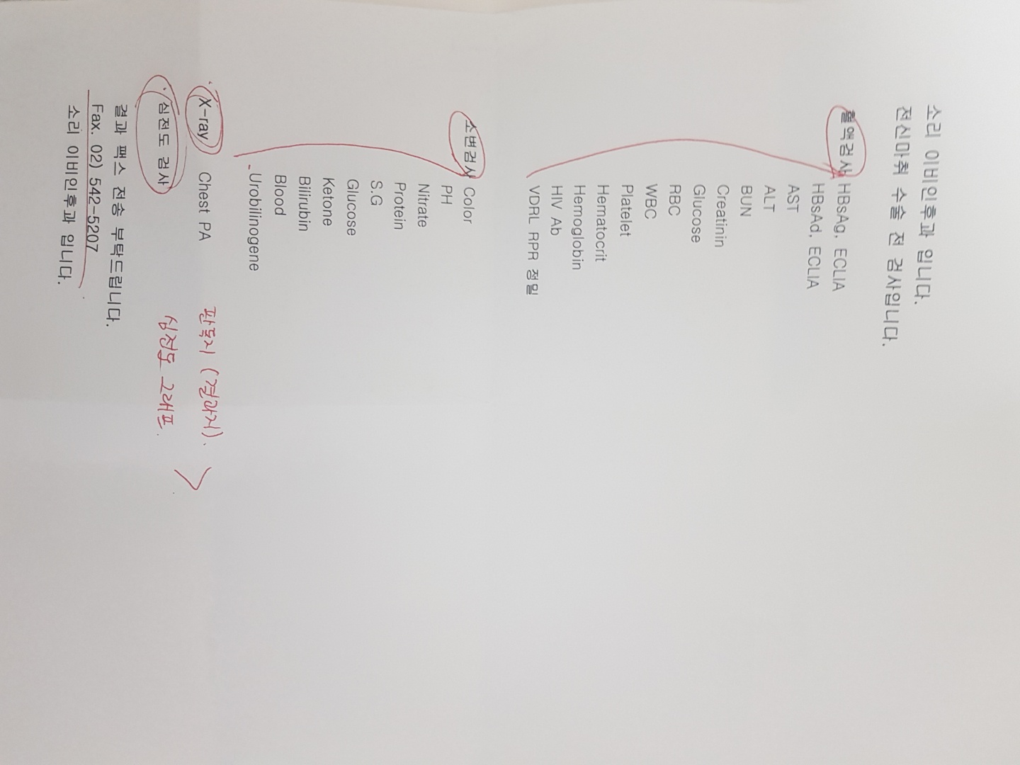 나는 고막이 안으로 말려들어간 유착성, 그리고 안에 고름이 차있는 진주종성 중이염 판정을 받고 수술을 하는 것으로 판정이 났다. 수술을 하기위한 피, 소변검사는 소리이비인후과 병원에서 해주는데, 나머지 X-ray 사진, 심전도 검사는 내과에서 하고 팩스로 전달해야한다.