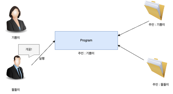 그런데 실행 파일이라면 특수한 권한 하나가 더 생깁니다. 이 파일을 실행할 경우에 갖는 권한, 즉 실행 할 때만 유효한 권한이요. 그게 뭐냐면 실행할 때만 소유주의 권한, 혹은 소유주 그룹의 권한으로 실행되는 권한입니다. 예를 들어서 파일을 읽는 어떤 프로그램이 있다고 칩시다. 그리고 이 프로그램의 소유주는 “기쁨”이라고 할게요. 어떤 사용자 “똘똘이”가 프로그램을 통해서 파일을 읽을 땐 똘똘이의 파일밖에 못 읽습니다. 기쁨이의 파일을 함부로 볼 수가 없죠. 근데 착한 기쁨이는 나의 프로그램을 쓸 때 나의 파일은 읽을 수 있게 특별한 권한을 이 프로그램에 준다면 똘똘이는 기쁨이의 파일도 읽게 될 수 있습니다. 이와 같은 상황을 권한이 확장되었다라고 합니다.