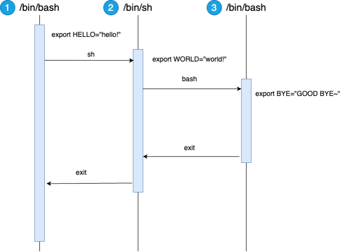 처음 로그인 쉘인 (1) /bin/bash에서 export를 이용해서 HELLO를 환경 변수로 등록하고 sh로 새로운 쉘을 시작합니다. 이때 (2)/bin/sh로 실행되는 환경이 바뀌게 됩니다. 여기서도 export를 이용해서 WORLD를 환경 변수로 등록하고 다시 새로운 (3)bash 쉘을 실행시켜서 실행 환경을 바꿉니다. 여기서 BYE라는 환경 변수를 등록합니다.