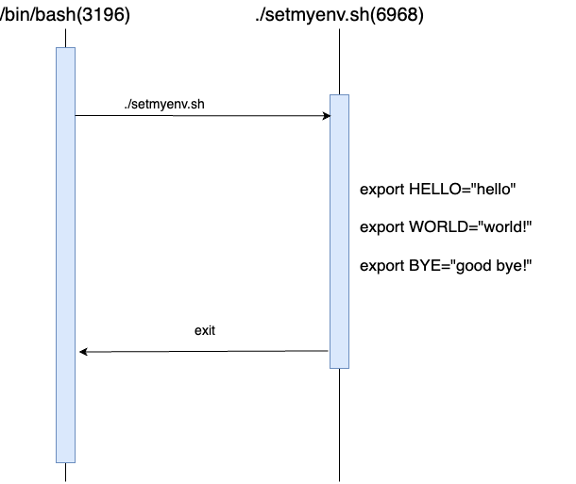 그런데 제가 명령어를 수행하는 프로그램의 ID가 3196이고, , ./setmyenv.sh라는 쉘 스크립트가 실행되는 프로그램 ID는 6968로 다르네요. 결국 이런 상황입니다.