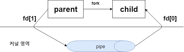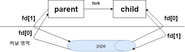 파이프는 커널영역에 생성되어 파이프를 생성한 프로세스는 파일 디스크립터만 갖고 있게 됩니다. 여기서 파일디스크립터 fd[1]은 쓰기용 파이프, fd[0]은 읽기용 파이프입니다. 그러니 우리가 만약 데이터를 fd[1]에 쓰게 되면 fd[0]으로 그 데이터를 읽을 수 있는 것입니다.
