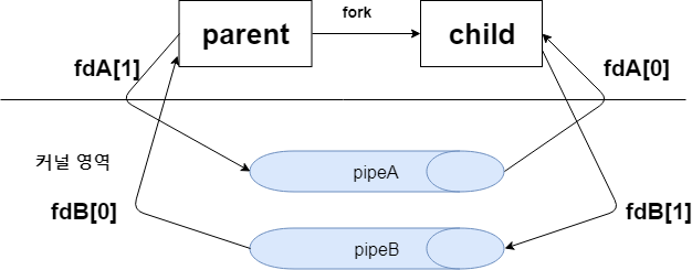 fdA와 fdB 2개 사용합니다. 부모프로세스는 자식에게 쓰기용으로 fdA[1], 자식프로세스로부터 읽기용으로 fdB[0]만 있으면 됩니다. 필요없는 fdA[0], fdB[1]은 닫아줍니다.