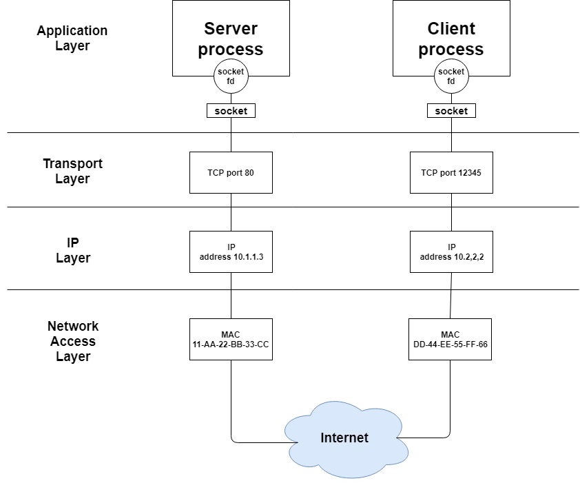 위의 그림은 TCP/IP에서의 인터넷 통신을 보여줍니다. 클라이언트의 컴퓨터의 물리적 주소(MAC 주소) DD-44-EE-55-FF-66이며 논리적 주소(IP 주소)는 10.2.2.2입니다. 클라이언트는 여러가지의 프로그램을 실행시키고 있는데 그 중 어떤 프로세스는 TCP 포트번호 12345를 사용합니다. 이 클라이언트 프로세스는 물리적 주소가 11-AA-22-BB-33-CC이며 논리적 주소 10.1.1.3인 서버 컴퓨터의 포트 번호 80번을 사용하는 서버 프로세스와 연결되어 있습니다.