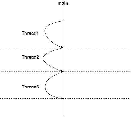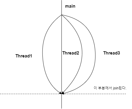main은 thread1, thread2, thread3을 수행시킵니다. 이때 thread1, thread2, thread3이 끝나면 다시 자신을 실행시키는 main와 합쳐지지요. 이해하기 쉽죠?