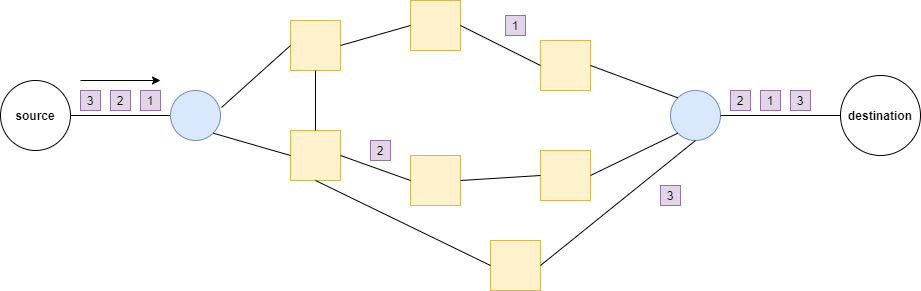 만일 송신에서 데이터를 1, 2, 3 순으로 전송했다고 할때 네트워크의 사용량에 따라 어떤 데이터그램은 늦게 도착할 수 있습니다. 3번 데이터그램이 가장 좋은 경로를 타고 와서 먼저 도착하게 됩니다. 그 이후에는 1번 데이터그램이 도착하겠네요. 마지막으로 가장 부하가 많은 경로를 타고 들어온 2번 데이터그램이 도착합니다.