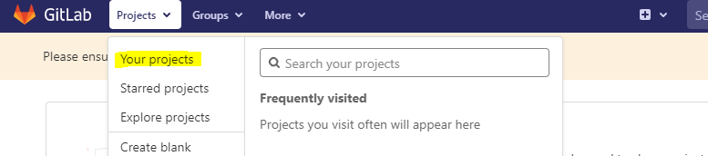 gitlab에 로그인하고 프로젝트를 생성할 준비를 합니다. 메인 화면의 좌측 상단에 Your projects를 선택하여 이동합니다.