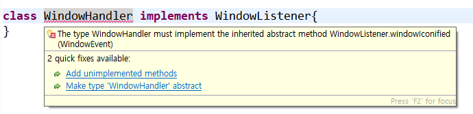 이렇게 되면 WindowHandler에 밑줄이 쫙 그어지는데, 마우스를 가져다대면 아래에 Add unimplemented methods가 생십니다. 이것을 클릭해서 모든 메소드를 구현해줍니다.