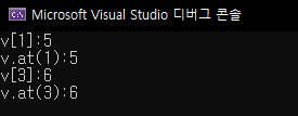 둘은 같은 값을 나타내고 있죠? 하지만 차이는 없을까요? 있겠죠. 만약 배열 접근 기호([])로 10번째 요소를 읽어봅시다. 현재 5번째까지 초기화했고, 10번째는 아직 접근할 수 없기 때문에 아래와 같은 에러를 보이고 종료하고 맙니다. at()통해서도 마찬가지일거에요. 하지만 둘의 차이는 예외를 뜨게해서 처리할수 있게 만들었느냐 아니냐입니다.