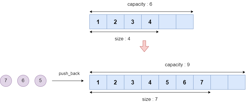 vector는 현재 가지고 있는 데이터의 수를 나타내는 크기(size)와 얼만큼의 데이터를 담을 수 있는지에 대한 용량(capacity)가 있습니다. 만약 용량이 전부 꽉 차게 되면 용량을 동적으로 더 늘려서 데이터를 추가할 수 있습니다. vector의 용량은 항상 size보다 크거나 같습니다. 아래의 그림처럼 capacity가 모자라게 되면 늘리게 되는거죠.