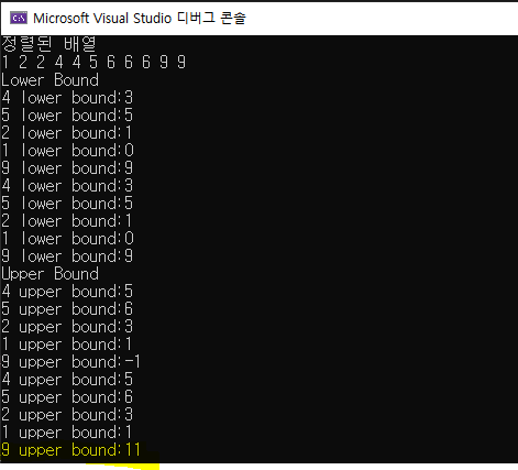 printf("%d upper bound:%d\n", 9, upper_bound(arr, arr + N, 9) - arr); //배열의 인덱스 초과된 값이 나옴