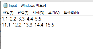 라인 단위로 -로 실수가 구분되어있습니다. 이것을 방금 전에 결과와 같게 만든다면 어떻게 구현하면 좋을까요? 우선 line단위로 입력을 받는다면 그 line은 "실수1-실수2-실수3..." 으로 구분되어있겠죠. 그리고 "-"를 구분자로 삼아서 nextDouble() 메소드로 읽어주면 됩니다. 그래서 Scanner가 2개가 필요합니다. 아래의 코드가 그 구현을 보여줍니다.