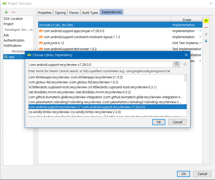 File - Project Structure - App - Dependancies 의 오른쪽 +를 누른 후 recyclerview를 검색하여