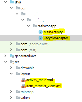 아직 RecyclerAdapter가 없기 때문에 오류가 발생하는데 우선 할당해놓고 이후에 Adapter class를 만들어봅시다.