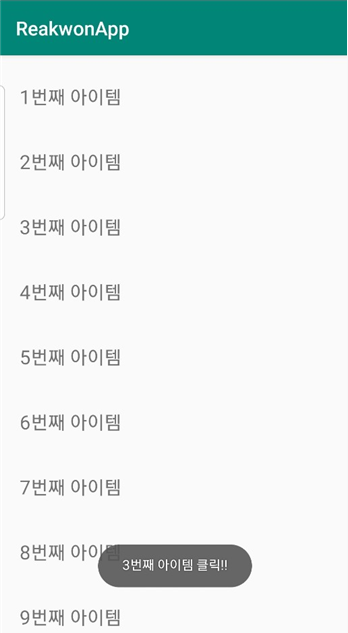 여기까지만 진행하면 조금 심심하겠죠? 이제 아이템이 클릭이 되면 Toast로 클릭되었다는 메시지를 띄어봅시다.